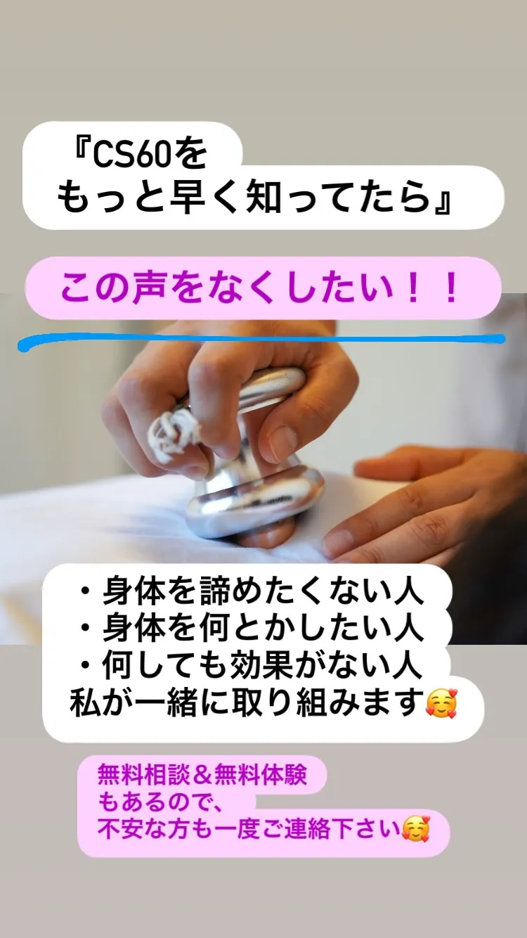 『CS60をもっと早く知ってたら』この声をなくしたい!!・身体を諦めたくない人・身体を何とかしたい人・何しても効果がない人私が一緒に取り組みます無料相談&無料体験もあるので、不安な方も一度ご連絡下…
